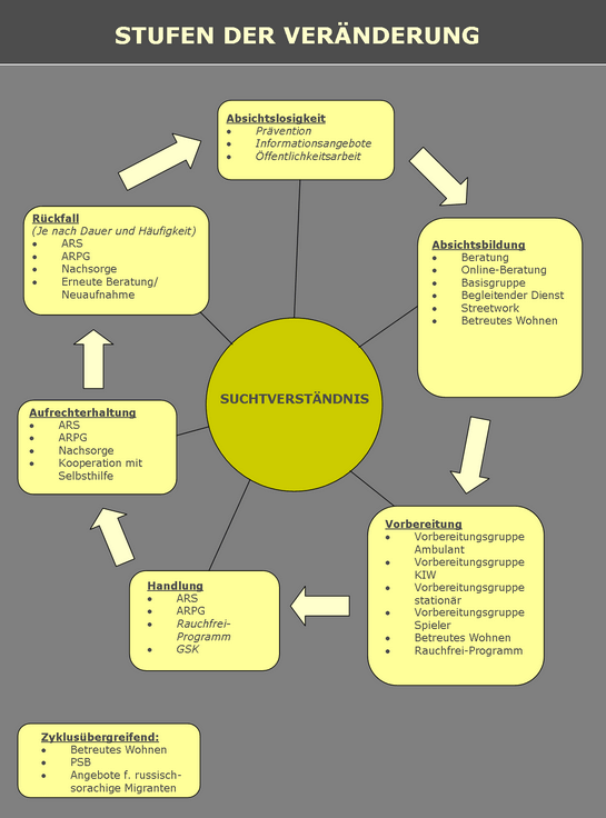Die Fachambulanz Sucht berät, behandelt und betreut Menschen bei Problemen im Umgang mit Suchtmitteln mit dem Ziel einer gesünderen Lebensführung. Dabei orientieren wir uns am Transtheoretischen Modell von Prochaska und DiClemente (1994), das jede persönliche Veränderung im Rahmen einer Suchtmittelgebrauchsstörung als dynamischen Prozess versteht, der immer wieder differenzierter ambulanter, teilstationärer und stationärer Hilfen bedarf. Wir halten daher ein breites Spektrum an zieloffenen Angeboten vor, das Menschen in unterschiedlichen Lebenslagen und Stadien der persönlichen Veränderung anspricht.